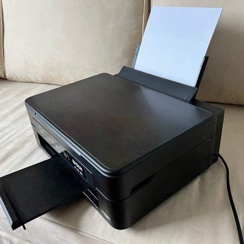 Jeg sælger denne Epson printer, der er brugt, men fremstår som ny. Der er indbygget scanner i den og der medfølger blækpatron, hvor mængden af blæk er afbilledet. Vi har ikke brugt den, det sidste års tid, og derfor sælges den. Den er testet og fungerer som den skal.