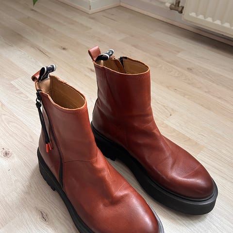 Dame støvler i læder. Fremstår som afbilledet. Sålen er hård med gummibund. SKOEN FREMSTÅR RUSTIK MED LET SLITTAGE PÅ SNUDEN; se billederne