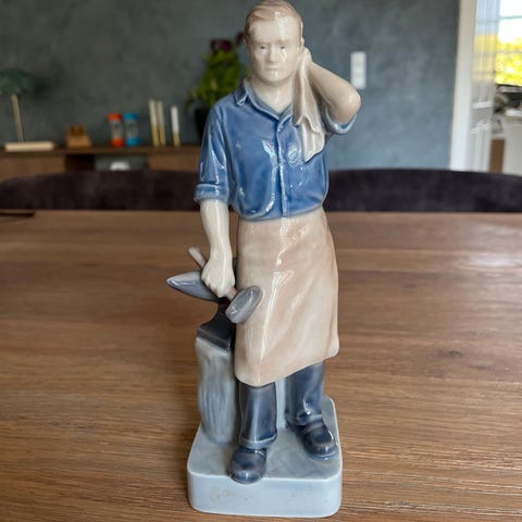Royal Copenhagen Figur 4502 forestiller en smed iført blå skjorte og beige forklæde. Figuren er fremstillet i porcelæn og viser smeden stående ved et ambolt med en hammer i hånden. Produktet er dekoreret med Royal Copenhagens signatur og modelnummer 4502 på undersiden.