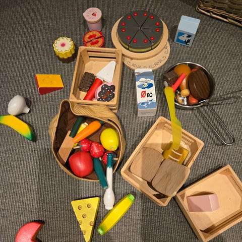 7 stk nyt legemad i massiv træ. Der er burgere, pommes fristes, fransk hotdog, cola chokoladedrys