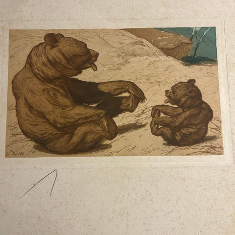 Radering. "Se söde Mo'er ! vi leger Fugle." Rad. Op. 23. Signeret i trykket. Trykplade 25 x 17,5 cm. Ramme 32 x 25 cm.