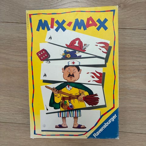 Ravensburger Mix Max brætspil med forskellige kort og spillekomponenter inklusive terning og instruktioner. Spillet indeholder farverige figurer og er designet til underholdning og social interaktion.