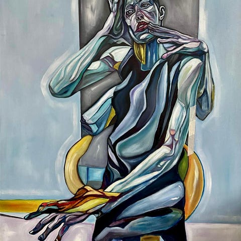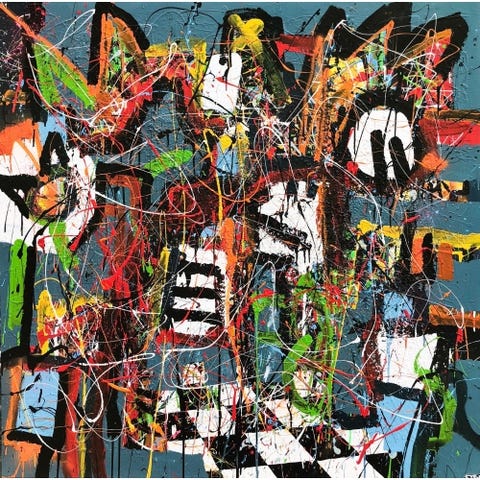 Dette abstrakte maleri viser en kombination af grønne, gule og blå farver med figurer i midten. Maleriet er indrammet og kan bruges som dekorativ vægkunst i hjemmet eller kontoret.