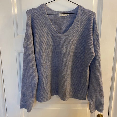 Sweater, bluse i strik fra Bluhmod i farven orangerød med detaljer ved udskæringen se billede 3. Sweateren er i størrelse 42 med et brystmål på cirka 98 cm og en længde på cirka 59 cm. Trøjen er fremstillet af 55% polyakryl og 45% bomuld.