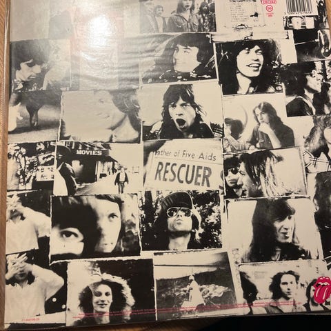 Rolling Stones Tattoo You vinylplade i sort farve. Pladen er en musikudgivelse med cover med kunstnerisk ansigtstatovering på forsiden. Passer til samlere og musiklyttere.