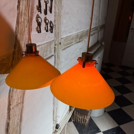 Pendel, Retro, To skomagerlamper med messing indfatning og hvid skærm af opalglas hhv metal.