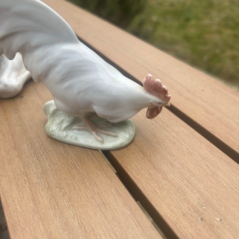 Sæt bestående af to porcelænsfigurer fra B&G en hane og en høne. Figurerne er håndmalede i naturtro farver med detaljeret finish. Hver figur står på en lille base, der efterligner jordbund. Velegnet som dekorative genstande til hjemmet ingen skår el afslag.