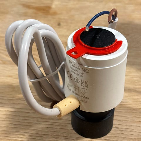 Danfoss TWA-A Thermal Wax Actuator designed for Danfoss RA valve. Operates at 230V with a 7-day normally closed (NC) function. Used for temperature control applications in heating systems.