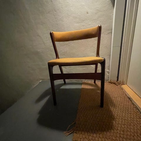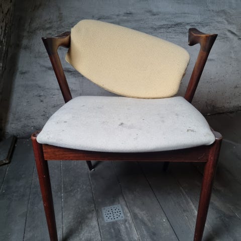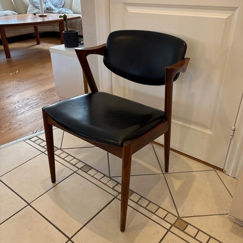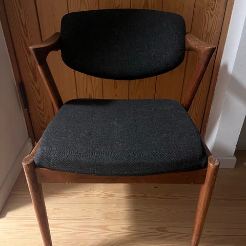 Jeg sælger denne smukke model 42 spisebordsstol af Kai Kristiansen. Den fremstår smukt, i fin stand, dog med en skræmme på bagsiden af begge armlæn (man lægger ikke mærke til det). Gjordene er strammet op, og man sidder komfortabelt, med vipperyg. Polstringen er også i fin stand, trods alderen