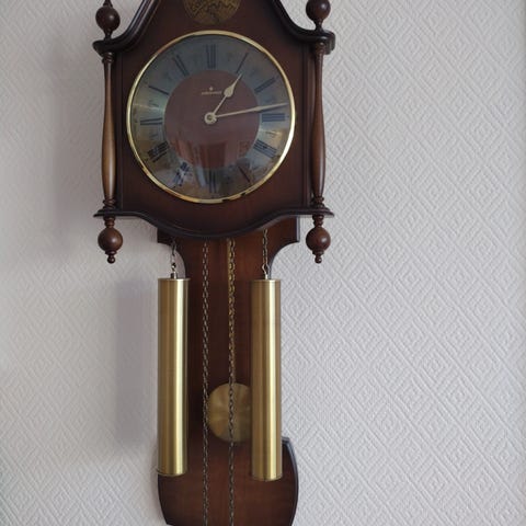 Udstyret med et fuldt fungerende mekanisk urværk med pendul og to vægte (kædetræk).