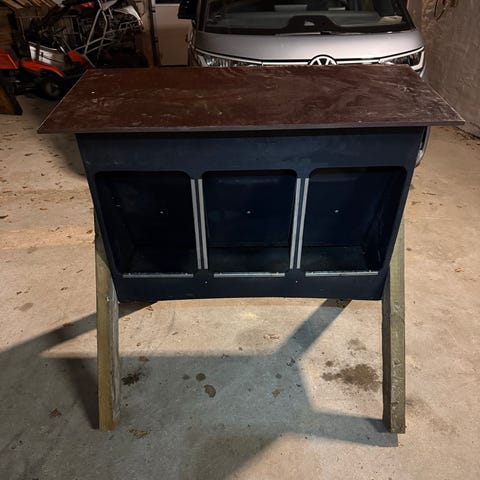 Solid foderautomat til fodring af hjortevildt. Model 60L eller 120L Mængden af foder kan justeres via skråplade. Den er opbygget i kraftig plastik, samt rustfri stål. Benene er kraftige trykimprægnerede 2x4” kernetræ. Låget er birkefiner plade, som har fået gori rundt i kanten. Så der er foderautomat i MANGE år. Model: 60L pris: 600kr 2stk 1100kr 3stk: 1600kr. Model 120L pris: 900kr 2 stk 1700kr 3 stk 2400kr. Forhør om mulighed for levering.