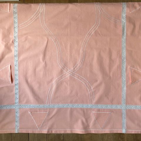 Gammelrosa bund med hvid broderi og hvid kniplet kantbort.
