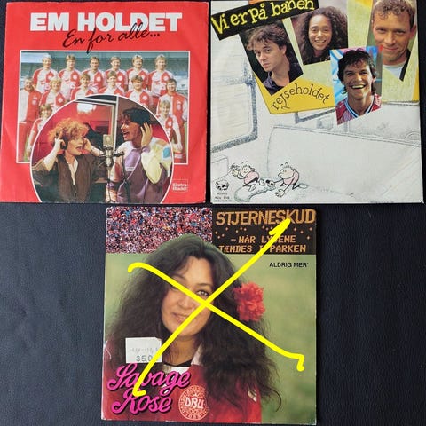 6 vinyl-singler med fodboldhits sælges stykvis eller samlet for 150,-.