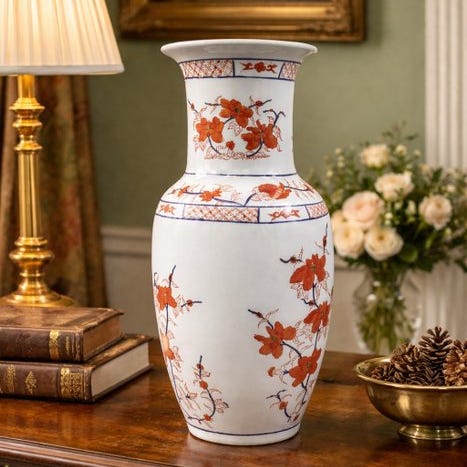 Håndmalet dekorationsvase i keramik med rund form og farverig blomster- og fugledekoration. Vasen har smukke detaljer i rød, blå, grøn og gul, og er egnet til brug som dekorativt element i hjemmet. Intakt og helt uden skår. Kan sendes og afhentes.