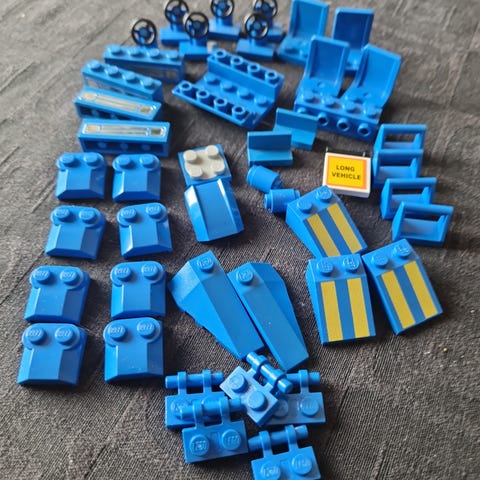 Flade blå legoklodser, lidt specialklodser som hængselsdele, kurvede klodser