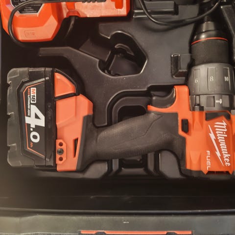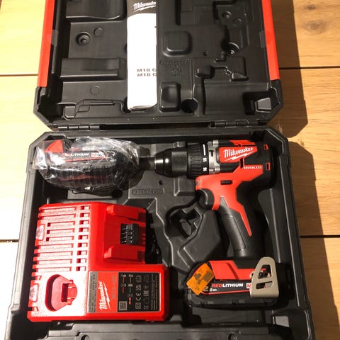 Milwaukee M18 boremaskine leveres med batteri og oplader i en bærbar kuffert. Værktøjet er designet til brug i forskellige bore- og skruopgaver og er egnet til både professionelle og private brugere.