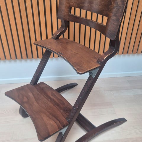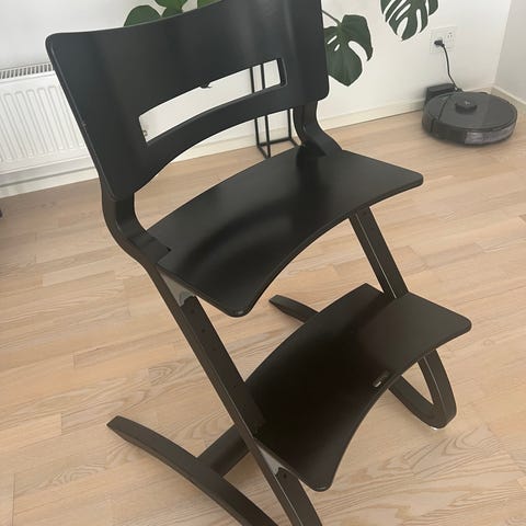 Leander Højstol i sort træ designet til børn. Højstolen har justerbar sidde- og fodplade for tilpasning til barnets vækst. Fremstillet i træ med sorte overflader. Stolens design sikrer stabilitet og komfort for barnet under måltider eller aktiviteter ved bordet. Nogle brugsspor og mindre ridser er synlige på træoverfladen. Inkl. bøjle, bakkebord (helt nyt) samt to puder i grøn og brun. Den grønne pude er lidt falmet i farven.