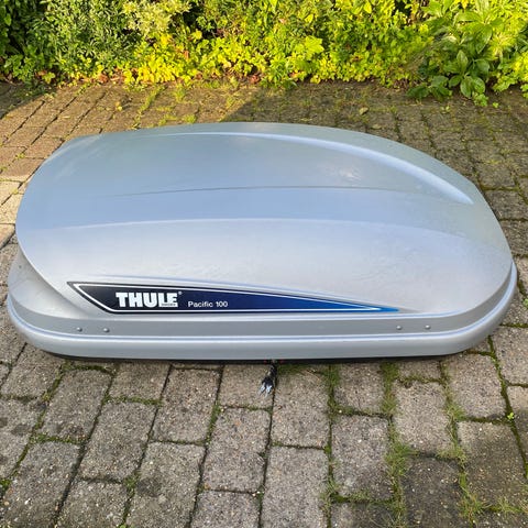 Thule Pacific 200 tagboks i grå farve. Designet til montering på bilens tagbøjler for ekstra opbevaringsplads. Materialet er robust og velegnet til opbevaring af bagage og udstyr under transport.