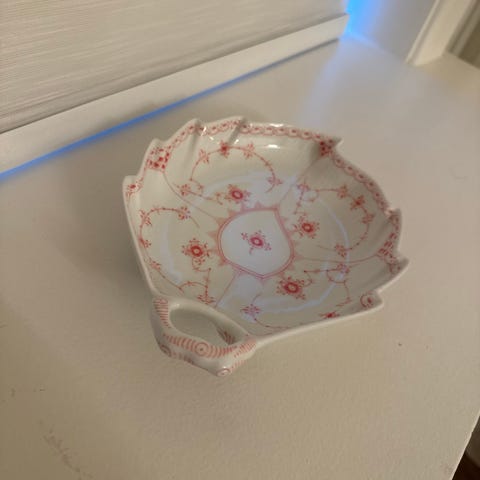 Royal Copenhagen WSX 428 porcelæn skål i hvid med blå håndmalet mønster. Fremstillet af porcelæn med karakteristisk bølget kant og detaljeret dekoration. Passer til brug som serveringsskål eller dekoration.