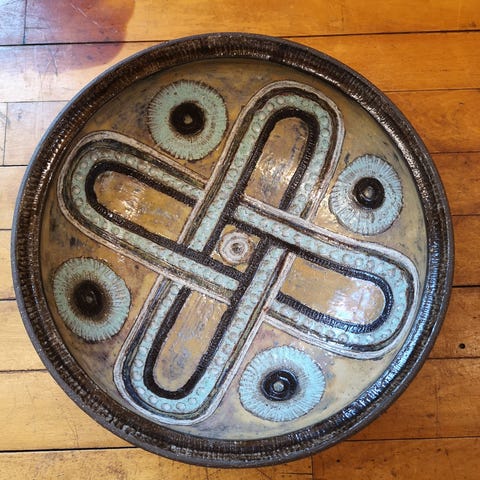 I den smukkeste blide glasur, måler ca. 22 cm ø.
