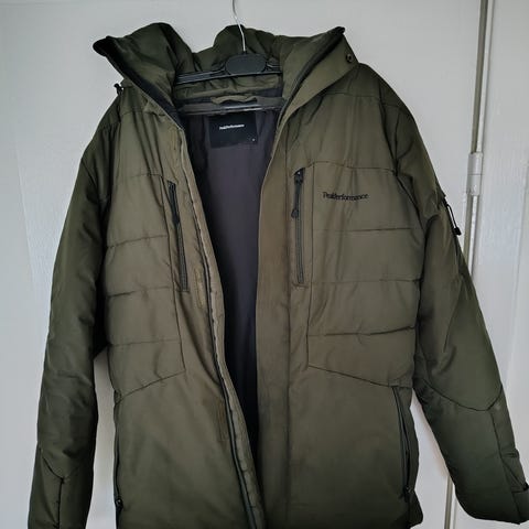 Peak Performance hybrid jakke i størrelse S. Jakken er gul med mørkeblå detaljer på ærmer og sider. Den har en quiltet forside og ryg, hvilket giver isolering og varme. Jakken har lynlås foran og en brystlomme med lynlås.