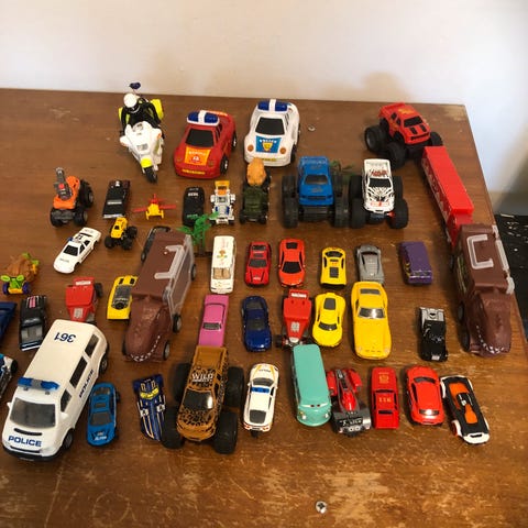3 biler Til salg, 3 stk legetøjsbiler til salg den gule med hvidt tag Morris mini mrk. Coroi har har ridser.