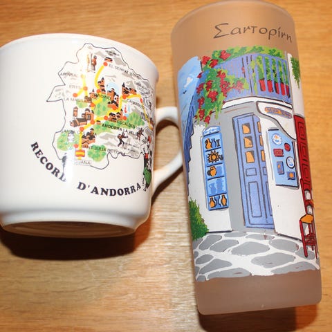 Porcelæn, Kop, Kremmerhuset, 4 Stk. hvide kopper med gråligt tryk. Kan gå i opvaskemaskinen og i mikrobølgeovnen. Fra Kremmerhuset. 100% intakte og med få ridser i bunden af den ene kop, fra en teske.