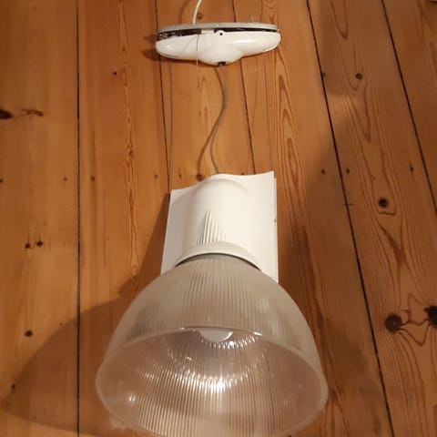 Denne helt fantastiske lampe er designet af Flemming Brylle og Preben Jacobsen, for eget produktionsselskab Quality Systems i 1970.Den ene strip er lidt løs, ellers er den i god vintage stand. Den måler 35 cm høj og 35 cm Ø. Den er også lavet i en bordlamper version.