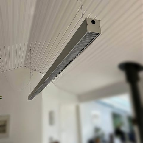 Strips Suspension ceiling lamp 1970 This absolutely fantastic lamp was designed by Flemming Brylle and Preben Jacobsen, for their own production company Quality Systems in 1970.One strip is a little loose, otherwise it is in good vintage condition. It measures 35 cm high and 35 cm dia. It is also made in a table lamp version.