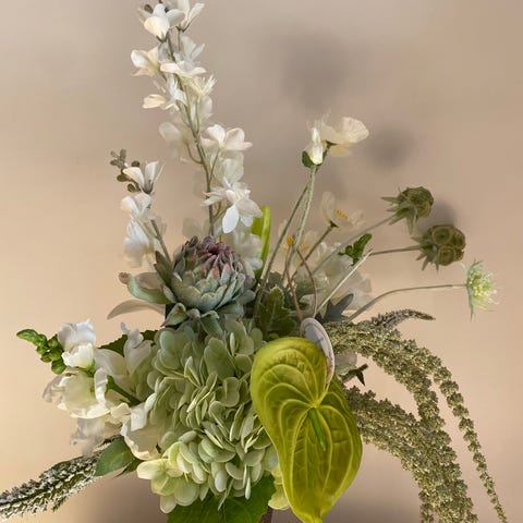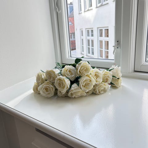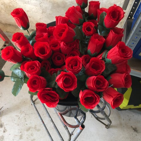 8 røde silkes roser i buket med sort og guld indpakning. Buketten indeholder flere røde kunstige roser arrangeret i et dekorativt sort papir med guldkanter, bundet med sort bånd. Velegnet som dekoration eller gave.