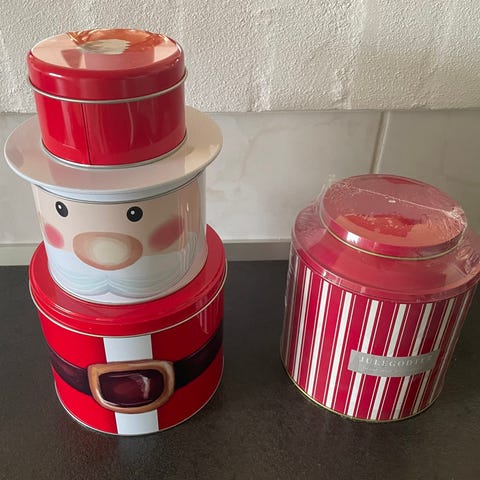 Flot sæt med 3 kagedåser i metal, perfekte til julens småkager, konfekt eller som dekorativ opbevaring. Dåserne har sødt julemotiv med nisser, rensdyr og gaver.