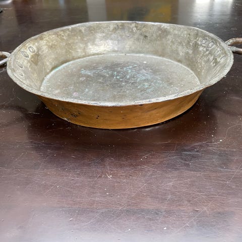 Patineret kobberfad med 2 håndtag.