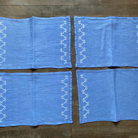 2 dækkeservietter med broderi, Retro stof dækkeservietter, 2 lyserøde dækkeservietter med broderet mønster i siderne.