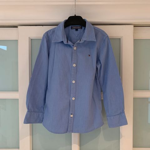 Rigtig fin lille skjorte, er i tvivl, om den nogensinde har været brugt, har dog ligget i skabet, så kunne godt trænge til et strygejern. :-)