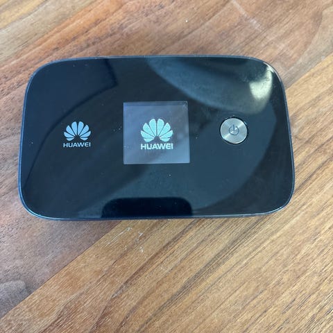 Huawei Mobile WiFi Router med batteri og SIM-kort slot. Enheden er sort og bærbar, designet til trådløs internetforbindelse via mobilnetværk.