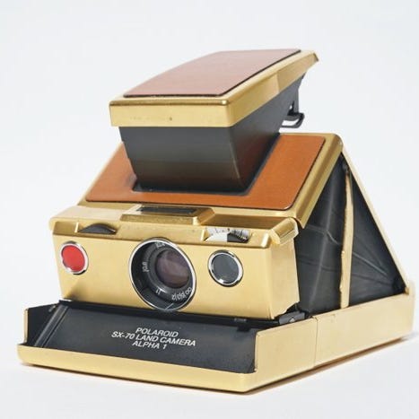 Her er en Polaroid SX-70 Land Camera, den klassiske foldbare model fra 1972erne – designet af Edwin Land selv.