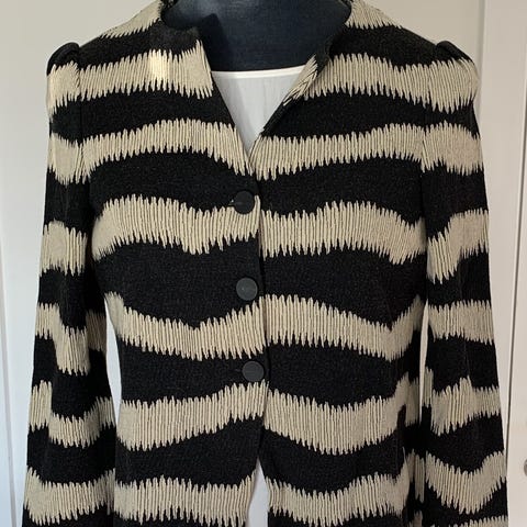 Cardigan fra Armani Jeans i sort og hvid stribet. Størrelsen på trøjen er angivet til 48, men det er en italiener, der har fundet den størrelse, jeg har sat den til en L/XL, vurder selv størrelsen ud fra brystmålet, som er cirka 106 cm og længden som er cirka 54 cm. Cardiganen er fremstillet i 50% polyamid, 25% uld og 25% akryl medens ribkanten er fremstillet af 96% viskose og 4% polyester. Blusen medfølger ikke.