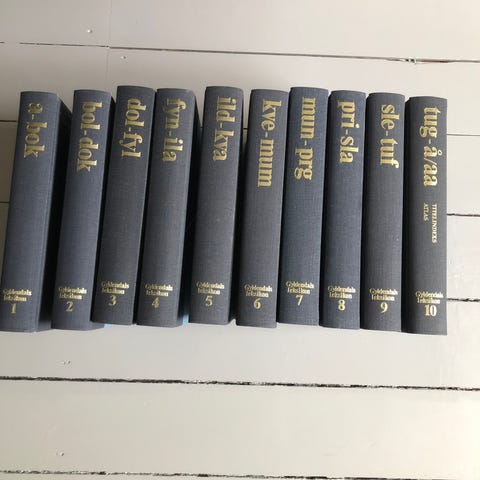 Et klassisk dansk opslagsværk i 10 bind – flot på reolen og perfekt til samlere eller retro-indretning.