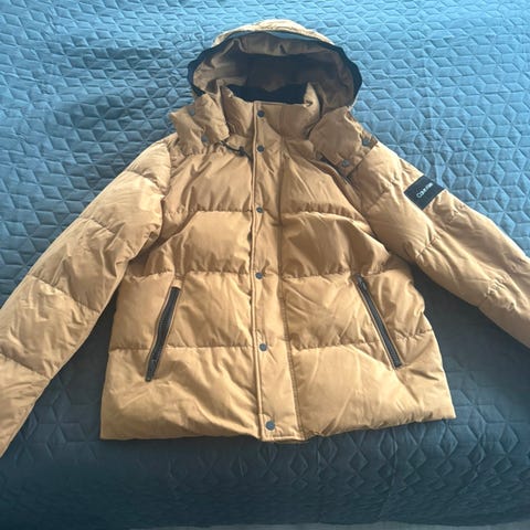 Calvin Klein Jeans vinterjakke til mænd i størrelse L. Jakken er grå og designet til udendørs brug i vinterperioden. Den har en fyldig polstring og en hætte med aftagelig pelskant. Jakken har lynlåslommer og knaplukning foran, hvilket giver ekstra beskyttelse mod kulde.