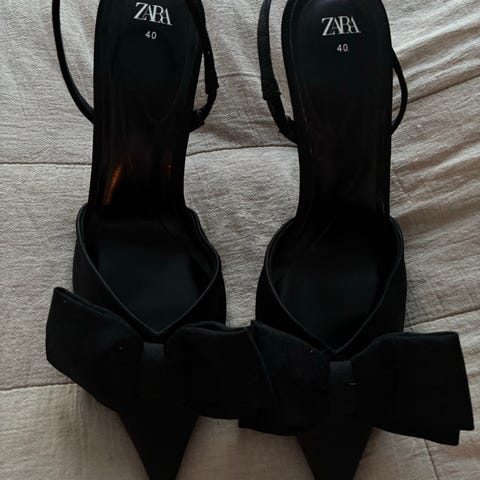 Zara højhælet støvle i sort med spids tå og dekorativ spænde. Støvlen har en slank hæl og lynlås på indersiden for nem påtagning. Fremstillet i syntetisk materiale. Størrelse 38.