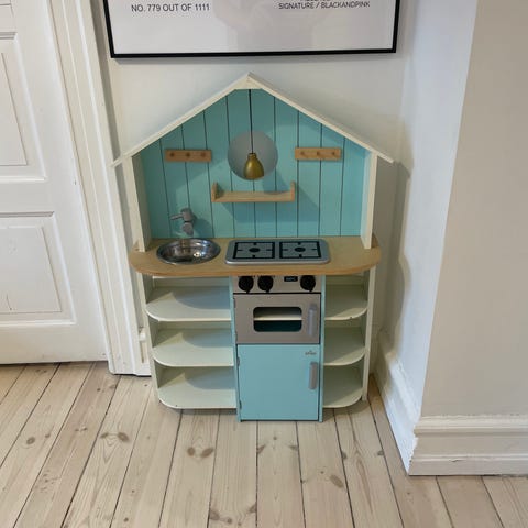 IKEA legekøkken i træ. Køkkenet har ovn, kogeplader, vask og mikrobølgeovn. Der er en ridse i ovnens plastik låge. Derfor prisen.