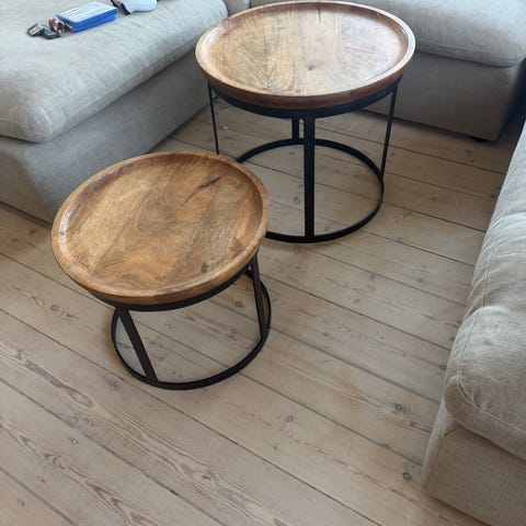 Tre fine runde sofaborde i grå og turkis, fejler ikke noget, men vi skifter bare farve i stuen.