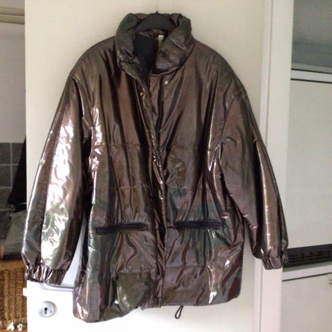 Blå damejakke i størrelse XXS. Jakken har en løs pasform med knapper foran og lommer på siden. Materialet fremgår ikke, men jakken har en enkel og funktionel design, egnet til daglig brug.
