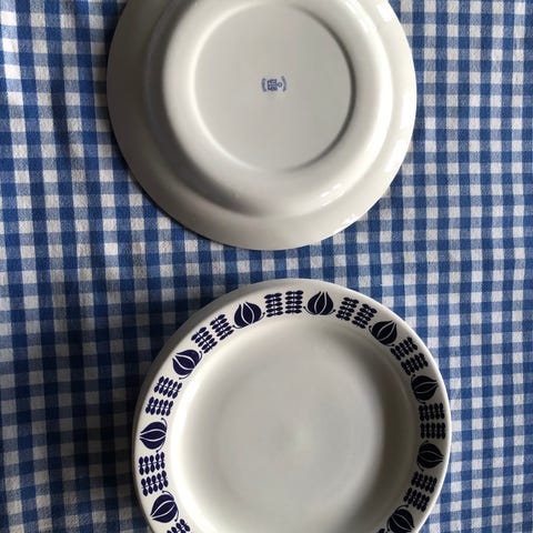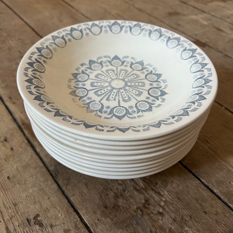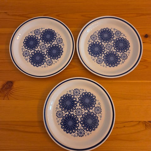 Norsk Egersund retro keramik tallerkener , 4 stk. De har en rund form med en glaseret overflade i gulfarve. Velegnet til servering af suppe, snacks eller andre retter. Materialet er keramik.