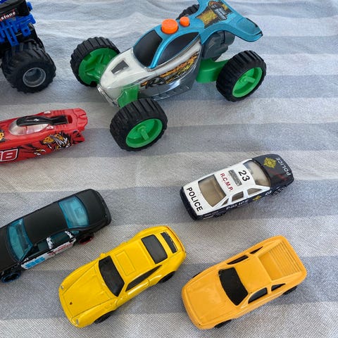 små biler og militær baner og stor bil med inventar