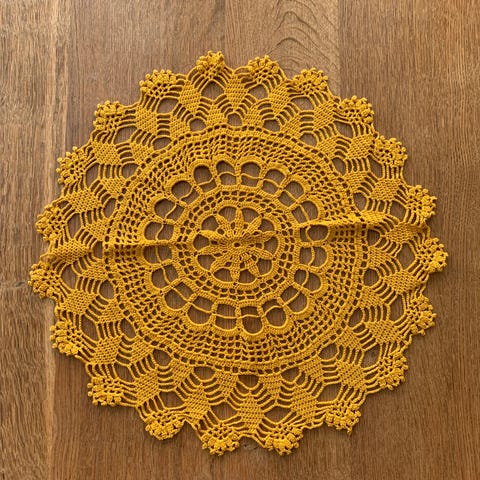 Man tør ikke gætte på, hvor mange timer det har taget, at hækle den og alt det garn der er brugt til dugen der vejer 565 g.