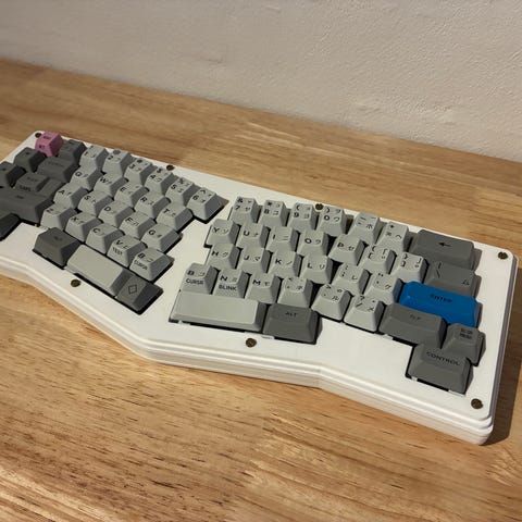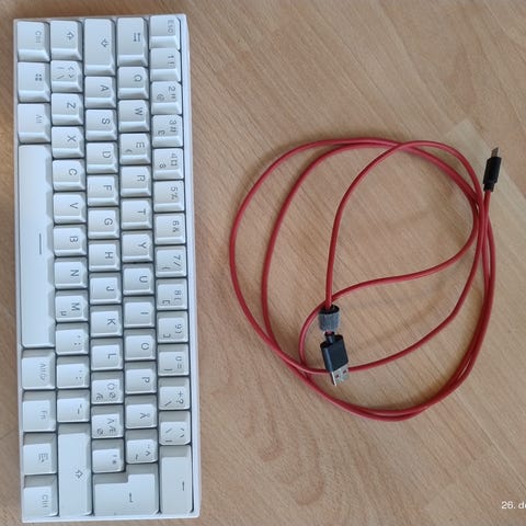 Anne Pro2 tastatur, hvid og udskiftelige farvede taster samt et rødt USB-C kabel. Tastaturet er designet til brug med computere og tilbyder tilpasningsmuligheder gennem udskiftelige taster.