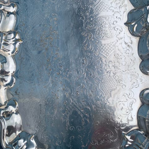 Elegant rektangulært serveringsfad i sølvplet, fremstillet i England.