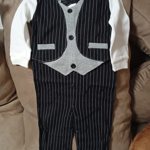 H&M sort heldragt til dreng i størrelse 68. Dragten har et design, der ligner en smoking med trykt skjorte og butterfly foran. Materialet er blødt og velegnet til små børn.