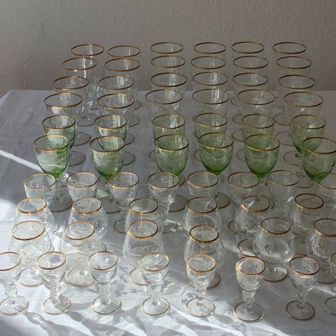 Håndblæste glas, hånddrejet stilke, håndslebne måger med guldkant.
